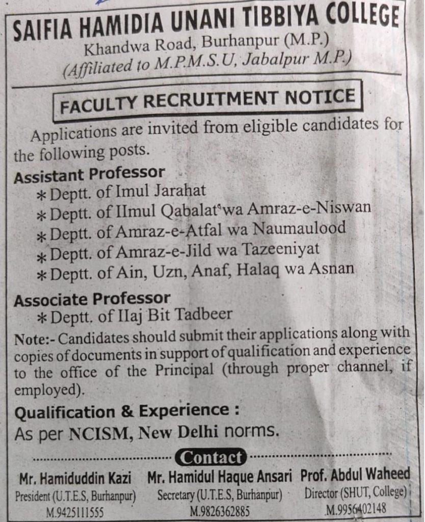 The small plant namely Saifia Hamidia Unani Tibbiya College was planted in 1962 by the Unani Tibbi Education Society of Burhanpur. It was named after the two world-renowned personalities: the one being late Dr. Taher Saifuddin Saheb (Q.S.), the spiritual Head Priest Dawoodi Bohra sect and the other one late Padma Shri, Padma Bhushan Alhaj Hakeem Abdul Hameed Saheb (A.Q.) the Founder trustee of Hamdard National Foundation, the Founder Chancellor of Jamia Hamdard, New Delhi.