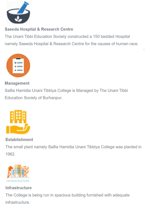 The small plant namely Saifia Hamidia Unani Tibbiya College was planted in 1962 by the Unani Tibbi Education Society of Burhanpur. It was named after the two world-renowned personalities: the one being late Dr. Taher Saifuddin Saheb (Q.S.), the spiritual Head Priest Dawoodi Bohra sect and the other one late Padma Shri, Padma Bhushan Alhaj Hakeem Abdul Hameed Saheb (A.Q.) the Founder trustee of Hamdard National Foundation, the Founder Chancellor of Jamia Hamdard, New Delhi.